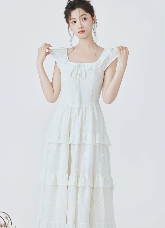Tea break French gentle style white puff sleeve dress child escape princess R1670