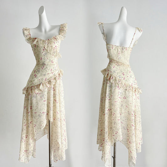 Tea break French floral dress seaside holiday style irregular fairy long dress R0035