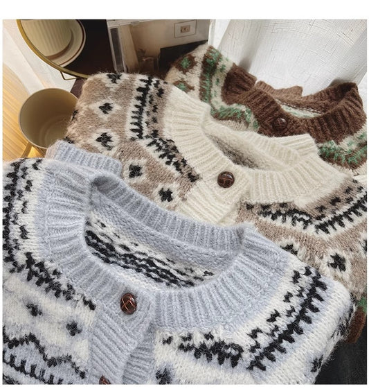 Vintage-style round-neck sweater jacket for women jacquard long-sleeved knitted cardigan S4796