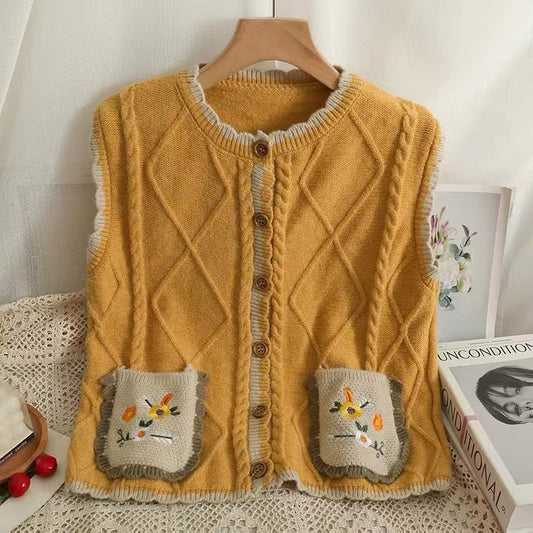 Vintage, Patchwork, Plaid, Loose Waistcoat, Embroidered Round Neck Single Breasted Cardigan Waistcoat S4360