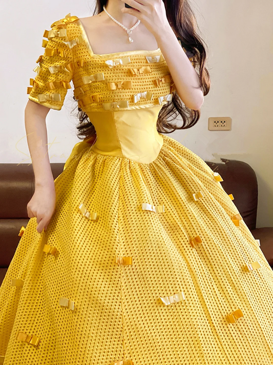 Yellow Square-neck Waist-Cinched Puff-Skirt Ball Gown & Bridal Gown R7374