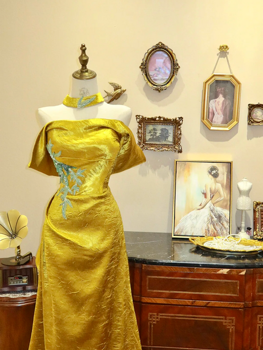 Gold off-the-shoulder strapless fitted long ball gown R7159