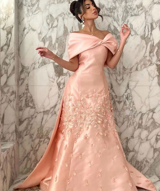 Blush Pink Luxury Arabic Evening Dresses Off The Shoulder Satin Beadings Prom Dress S6814