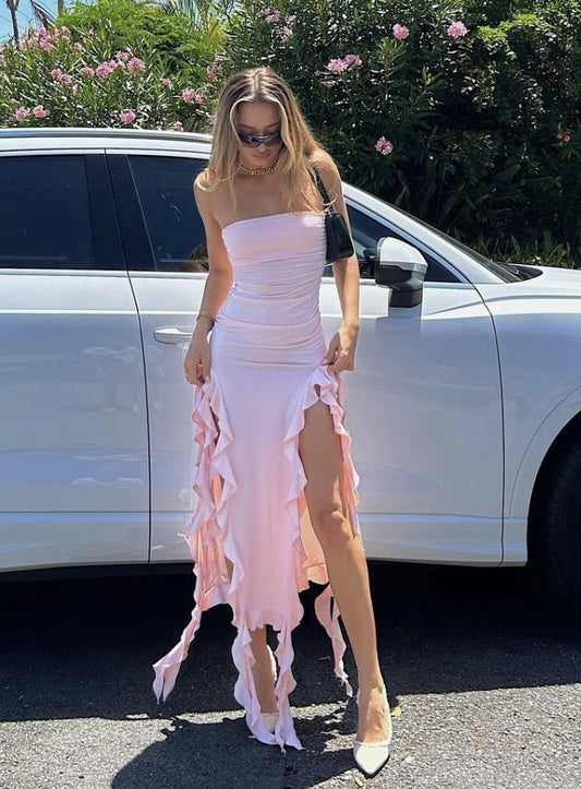 Pink Strapless Ruffle Evening Dress Women Sexy Bodycon Party Dress S6699
