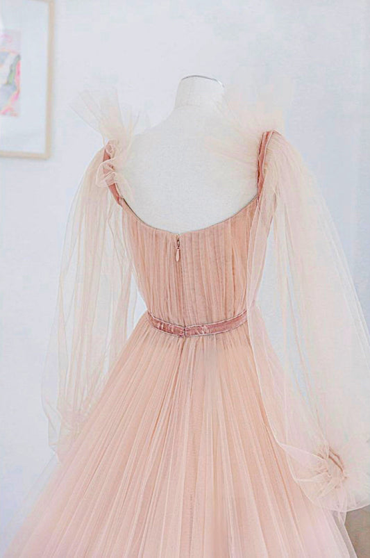 A Line Tulle Long Sleeve Pink Evening Dress Long Prom Dress S6334