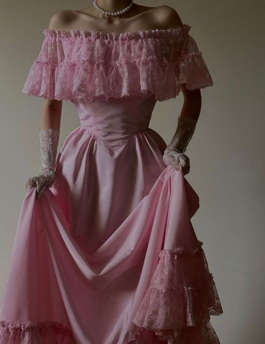 Vintage Long Pink Prom Dresses A-Line Off Shoulder Evening Party Gowns S6292