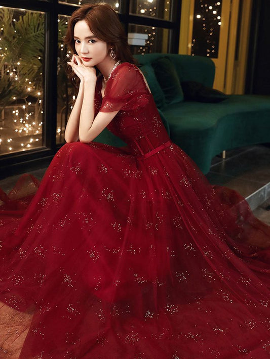 Burgundy A line tulle sequin long prom dress, burgundy tulle formal dress S2555