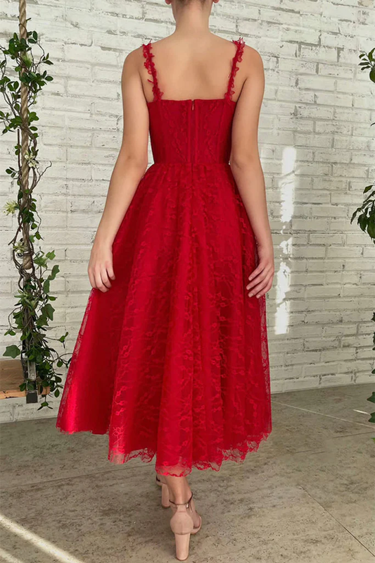 Red Lace Tea Length Prom Dress, Red Lace Homecoming Dress, Short Red Formal Evening Dress S1365