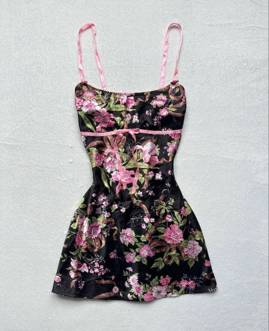 Pink floral strap low-cut sexy waist mini skirt homecoming dress R2616