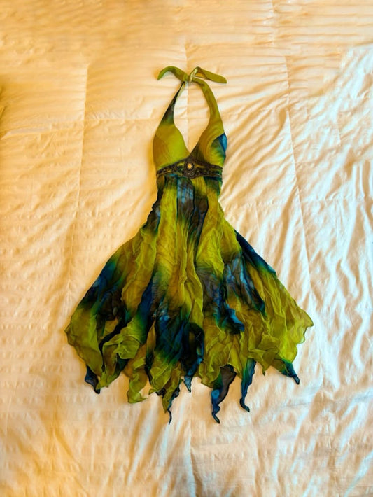 Yellow green floral V-neck sexy waist irregular skirt design short skirt homecoming dress R2618