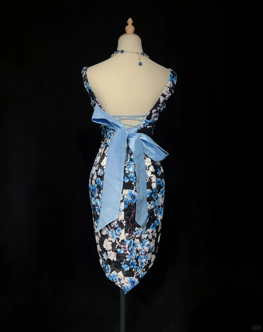Black background blue print series V-neck waist slim hip skirt homecoming dress R4962