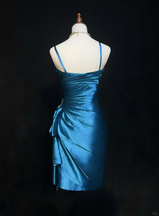 Blue suspenders waist design pleated slim hip-hugging mid-length skirt homecoming dress R4942