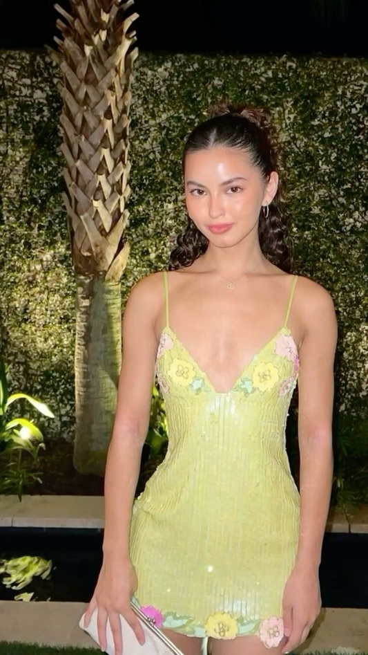 Yellow sequined suspenders waist slim skirt homecoming dress R5525