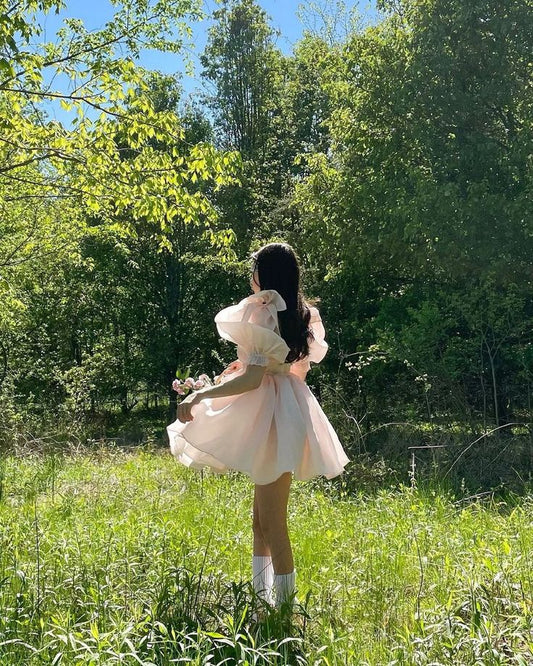 Light pink puff sleeve waist slim fit puffy princess skirt homecoming dress R3507