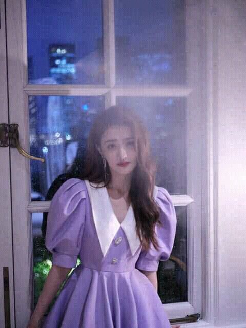 Purple Puff Sleeve Short Skirt V-Neck Waist Slim Short Skirt Homecoming Dress R3509