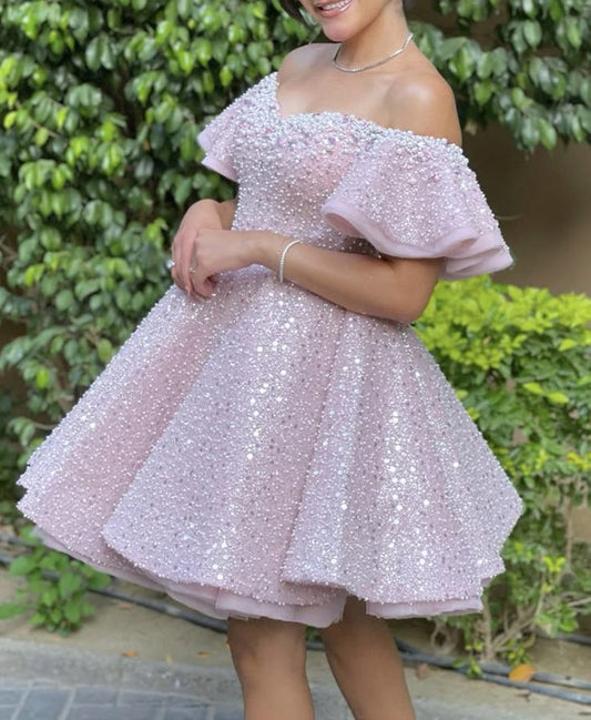 Pink Princess Dress One Shoulder Diamond Waisted Puffy Short Skirt Homecoming Dress R3516