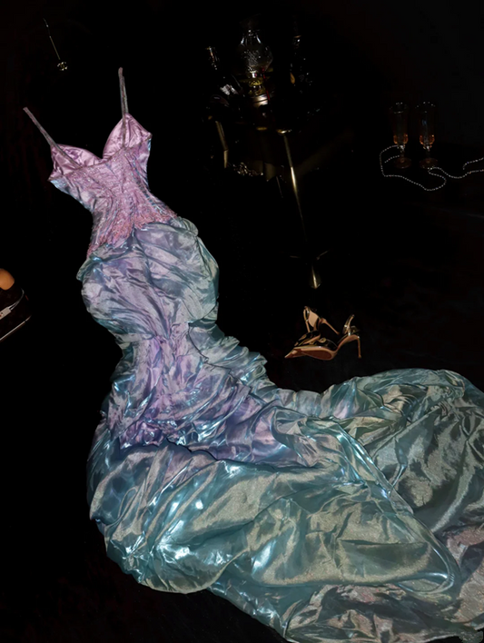Blue-purple halter-neck fitted long ball gown R7011