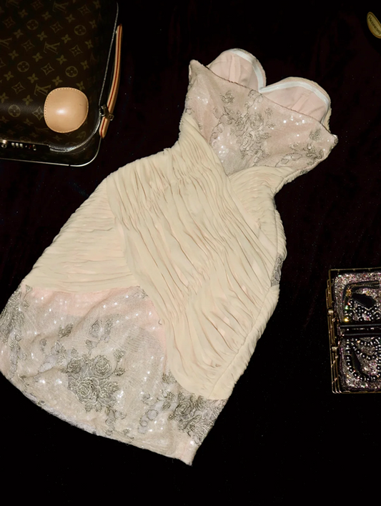 Light apricot strapless fitted waist bodycon short ball gown R6980