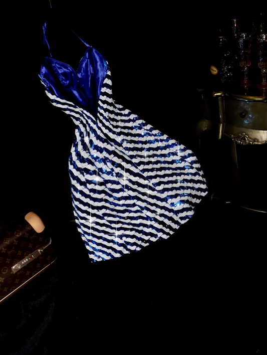Blue and white striped sequined halter neck sexy short ball gown R6981