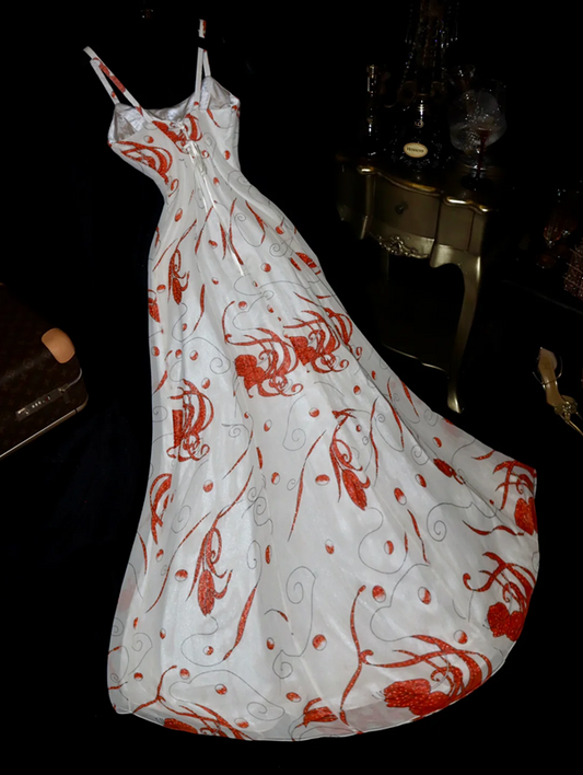 White halter-neck, fitted striped long ball gown, elegant and fairy-like style R6961