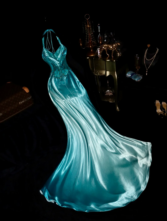 Light blue halter neckline with beaded details, fitted waist, elegant long ball gown R6903