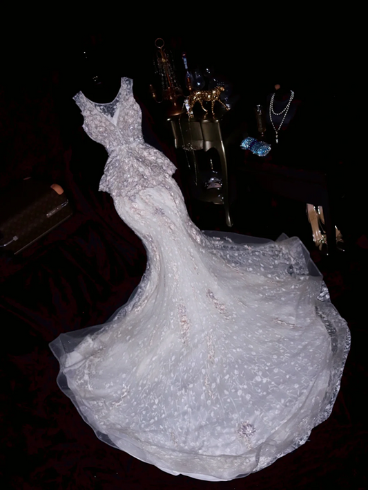 White strapless, fitted waist, pleated, elegant, fairy-like long ball gown R6901