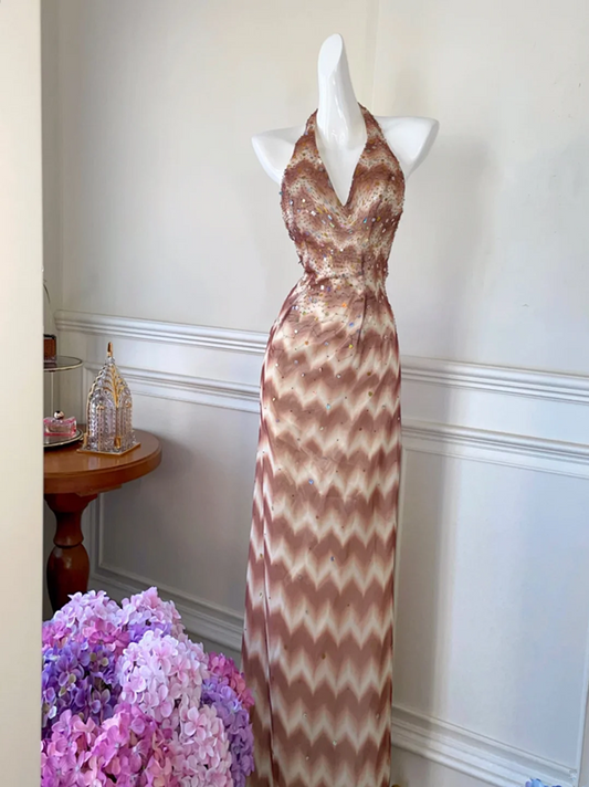 Pinkish-brown halter neck fitted waist long ball gown R6888