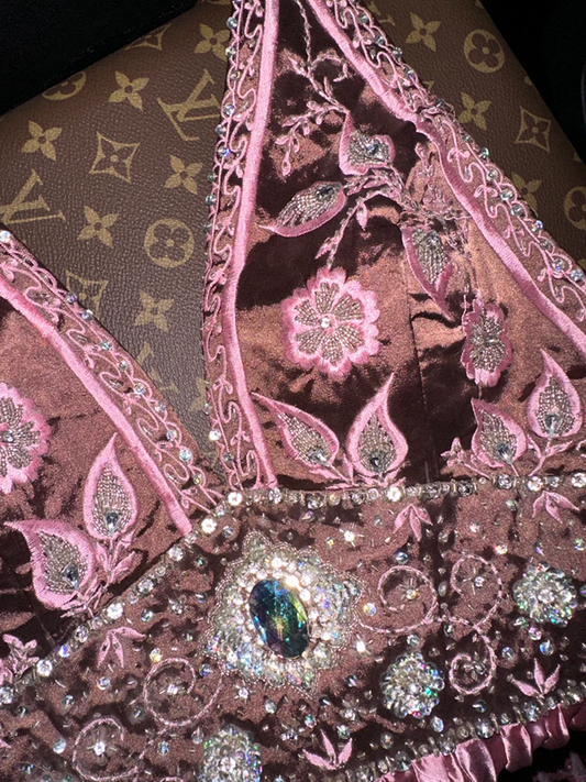 Champagne-colored halter-neck rhinestone-embellished fitted long ball gown R6868