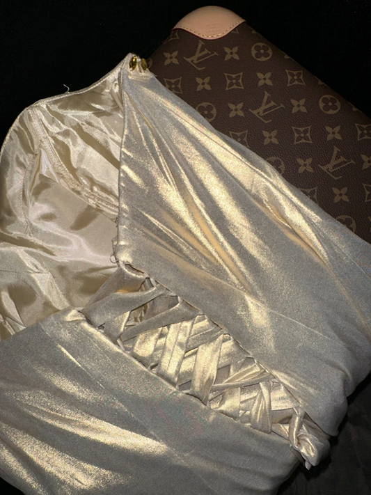 Gold satin one-shoulder fitted waist elegant long ball gown R6854