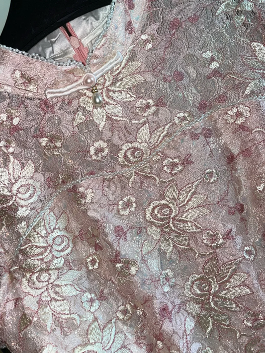 Black with pink floral print, fitted waist, elegant and classic mid-length ball gown R6863