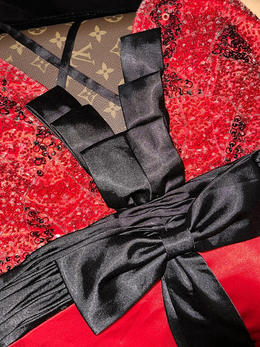 Red sequined halter-neck fitted long ball gown R6401