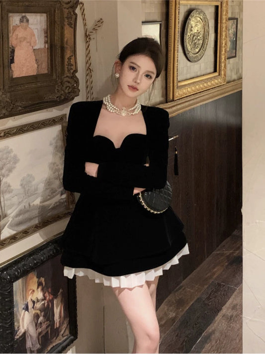 Black velvet long-sleeved dress for women banquet dress short party dress S5878