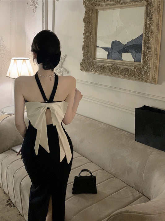 Halter neck dress women's long dress v-neck pleated a-line dress S5901