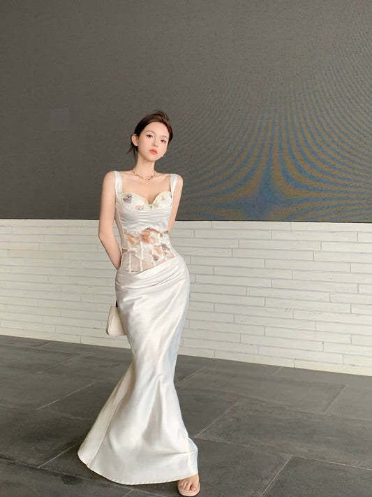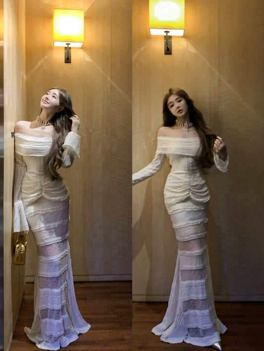 Off-shoulder white mermaid long sleeve dress lace splicing long party dress S5906