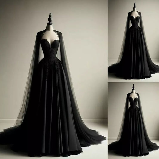 Black Tulle Evening Dress with Cape Sleeves Elegant Women Luxury Formal Party Gowns S6396