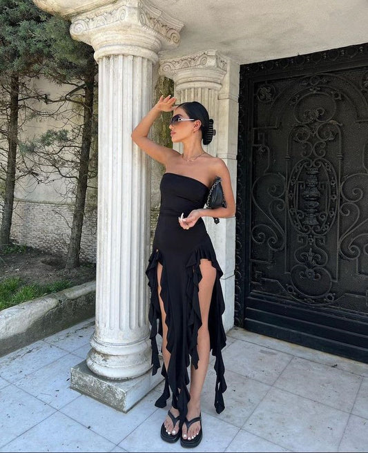 Elegant Strapless Black Irregular Dress Women Sexy Sleeveless Evening Dresses S6119
