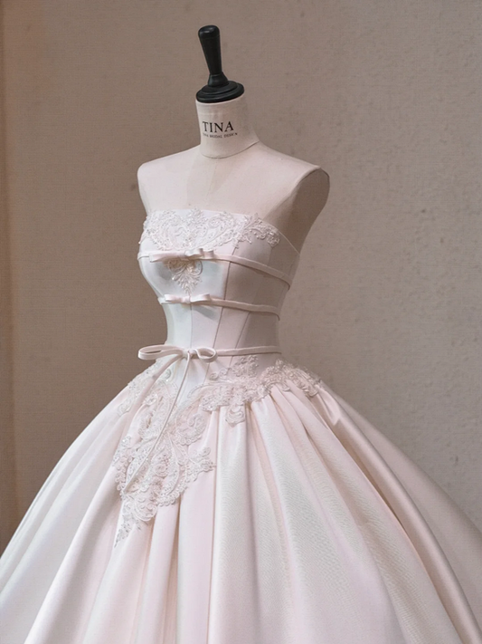 White Strapless Satin Pleated Waist Slim Fit Puffy Skirt Long Dress Bridal Gown R5720