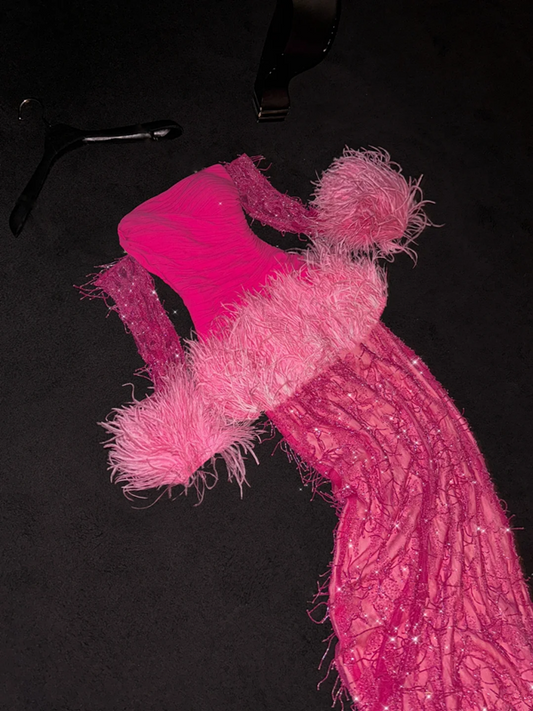 Black halter-neck fitted dress paired with a pink long ball gown with a train, bridal gown R8791