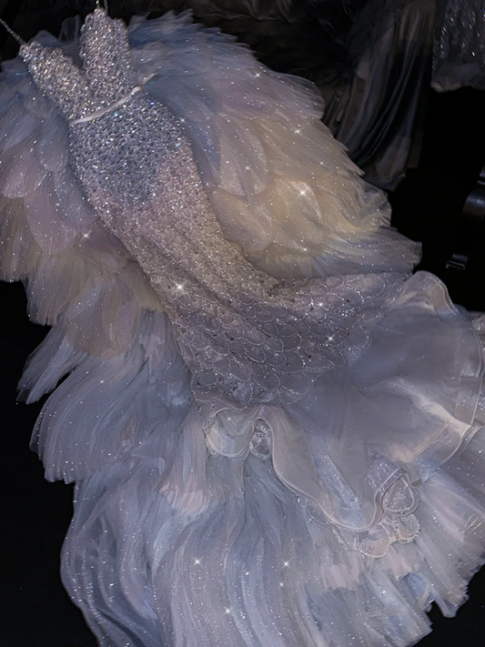Light blue sequined halter-neck fitted long ball gown/bridal dress R8806