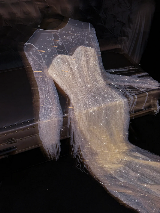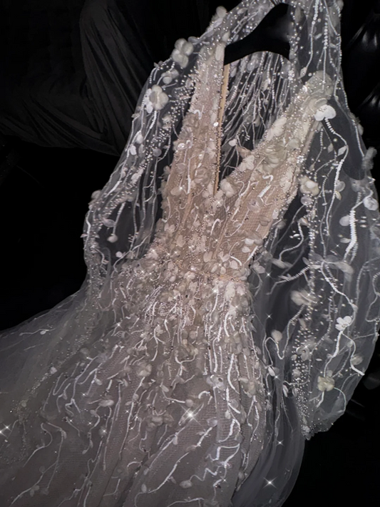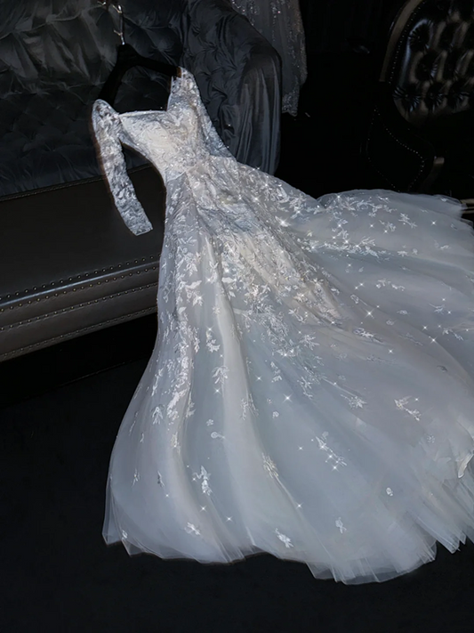 Silver sequined round neck long-sleeved white inner layer fitted waist long ball gown, bridal dress R8796