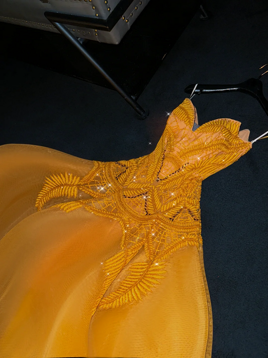 Mustard yellow halter-neck, fitted waist, full skirt, mid-length ball gown, bridal dress R8798