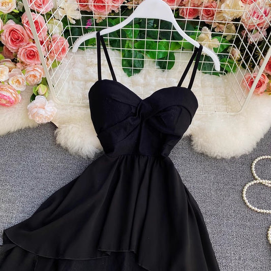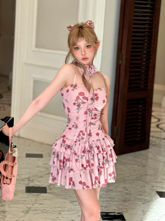 Rose mesh lotus leaf cake skirt waist strap dress R5254