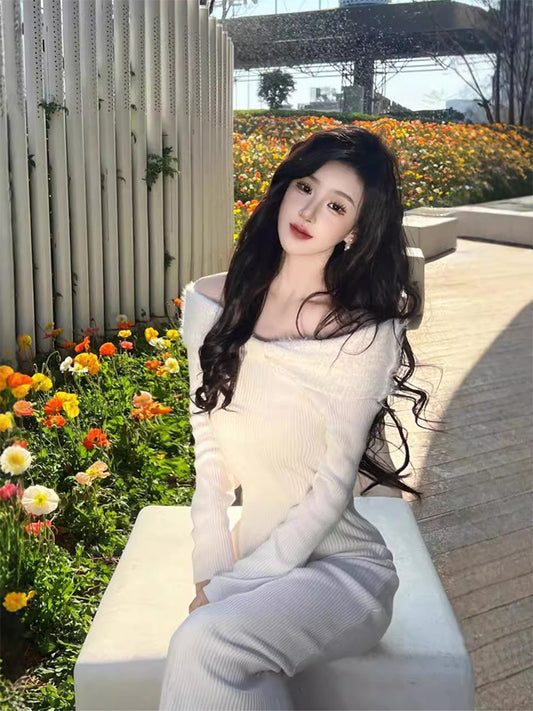 Birthday dress high-end party dress high-end niche bow long-sleeved one-shoulder dress R1796