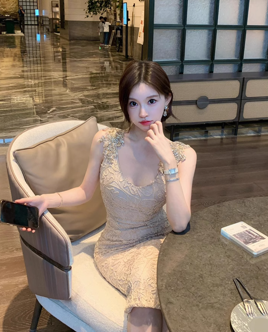 Birthday dress high-end party dress niche high-end French heavy-duty halter dress R1809