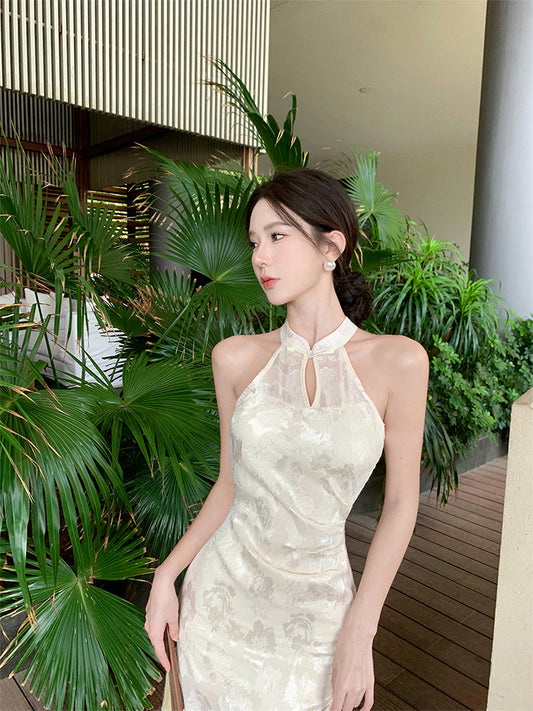 Girls improved cheongsam 2025 new style national style jacquard sleeveless halter dress R1767