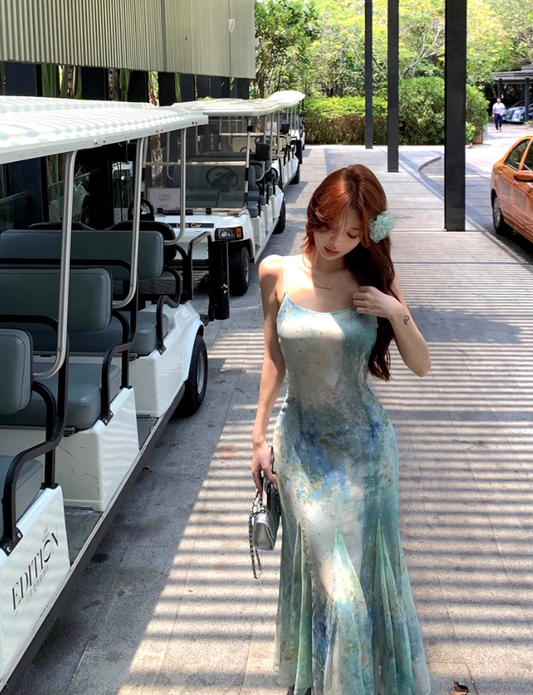 Blending fishtail skirt waist slimming princess holiday suspender dress long skirt R1737