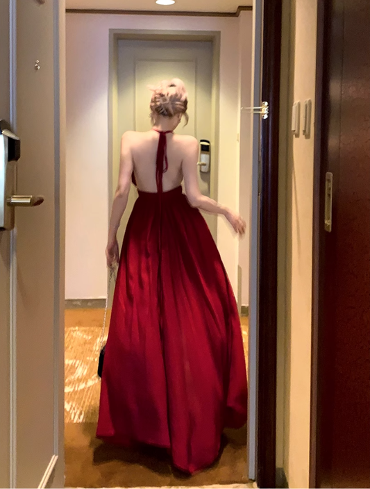 Fairy lace halter neck red dress holiday beach dress deep v backless slit long dress R1740