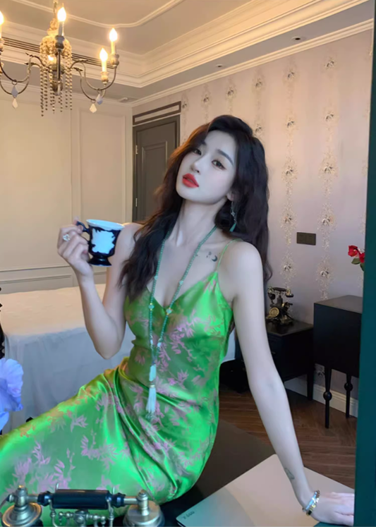 French green halter neck short skirt dopamine holiday style slim waist a-line dress R1631