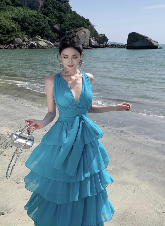Blue seaside holiday long dress cake dress halter neck backless dress waist beach dress R1589