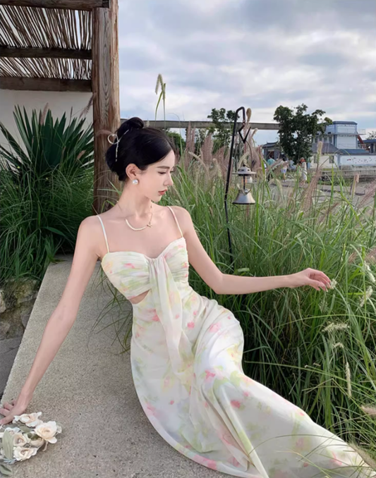 Travel wear fairy air backless dress seaside vacation dopamine green fairy long skirt R1594